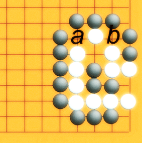 If Black plays a, White replies at b, and vice versa. Since each half of of the white group touches both of the internal liberties, White is alive.